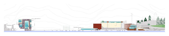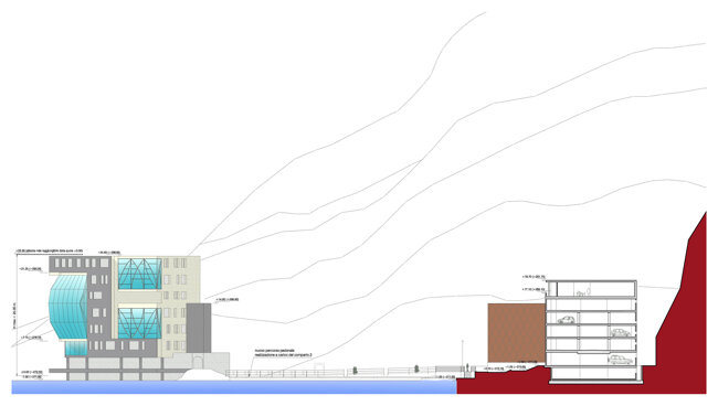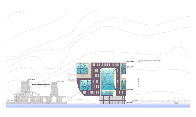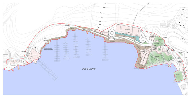 Il masterplan, nella sua articolazione degli spazi costruiti, propone di creare uno spazio pubblico pedonale che garantisca una necessaria ricomposizione tra i fabbricati esistenti della fornace, della struttura abbandonata dell'ex funivia (casaccia), il lungo lago e le attrezzature pubbliche esistenti (lido, porto turistico).