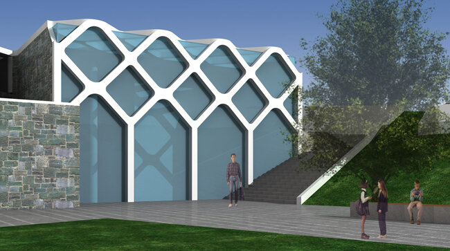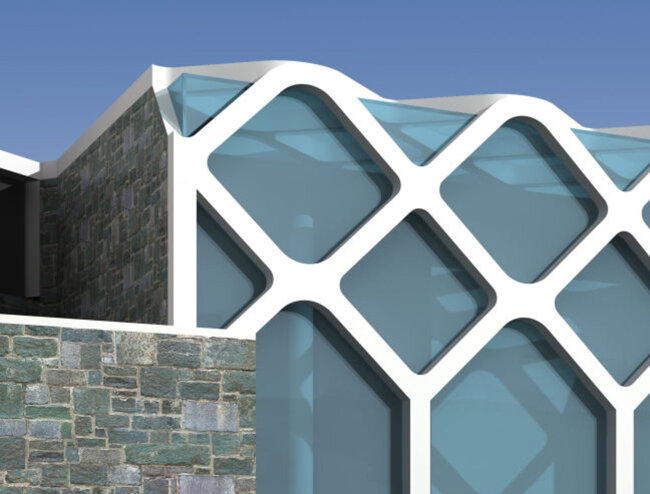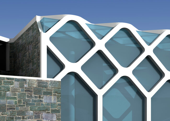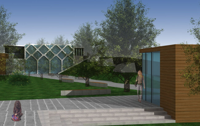 Il fabbricato servizi al livello del parco si caratterizza da un volume architettonico puro: un parallelepipedo in vetro racchiuso da strutture lineari e sinuose in acciaio bianco.