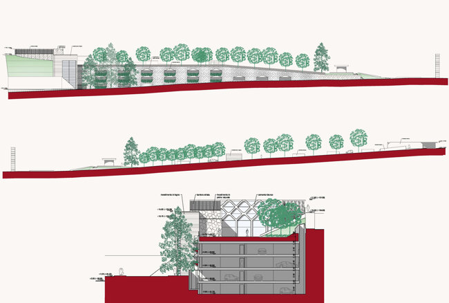 Il parcheggio in struttura si articola su 4 distinti livelli ed è accompagnato da un fabbricato posto sul livello del parco dove si collocano i servizi di ingresso, sosta, punto informazione e ristoro.