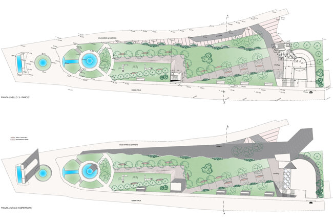Il progetto propone un parco e un parcheggio interrato con l'intento di realizzare un unico sistema verde/pedonale con l’adiacente Piazza Indipendenza.